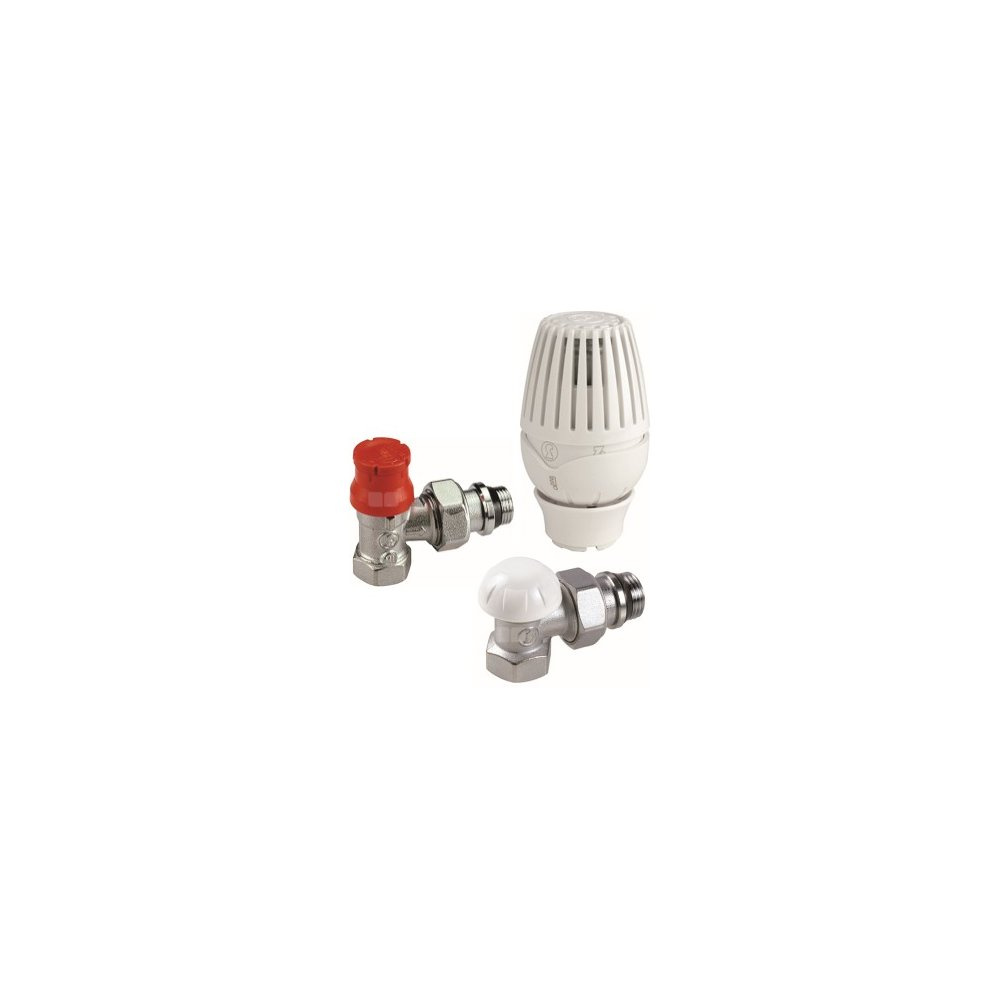 Zestaw termostatyczny do grzałki z nastawą wstępną: głowica termostatyczna, zawór termostatyczny z nastawą wstępną, zawór odcinający. Nie zawiera ogólnego opakowania.