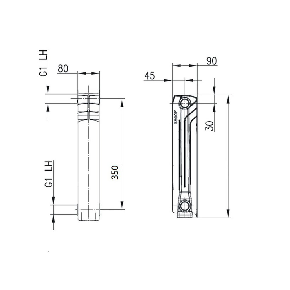 Grzejnik żeberkowy KFA Armatura G350F aluminium, podłączenie boczne 422 x 80 mm, kolor biały (RAL 9010)
