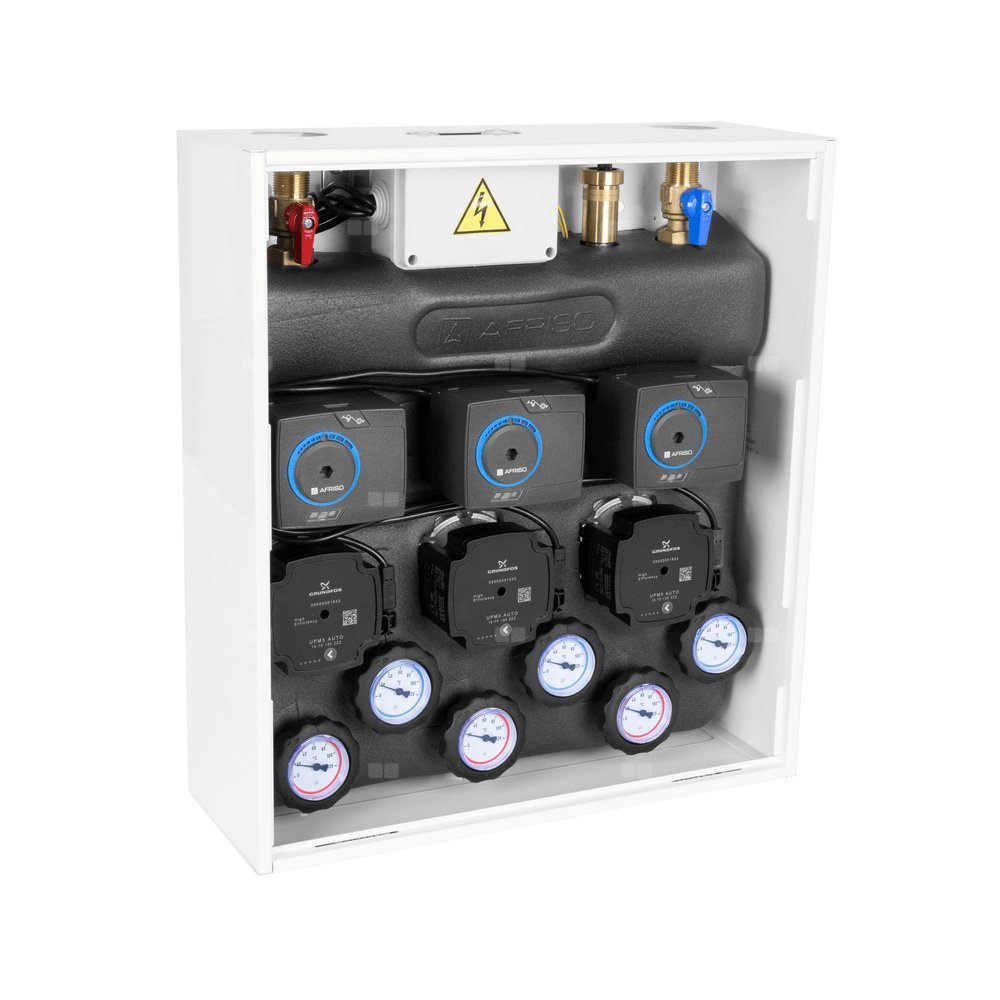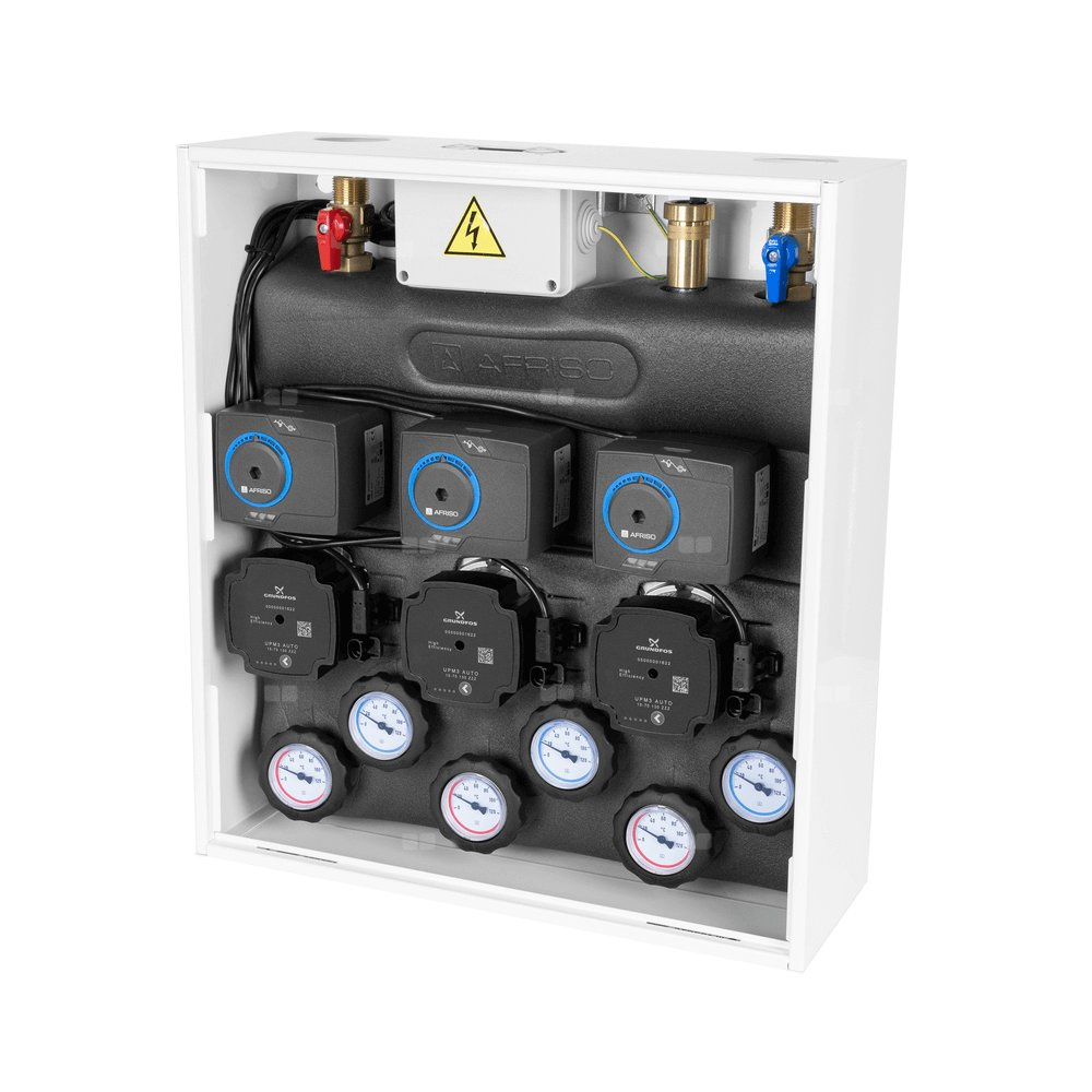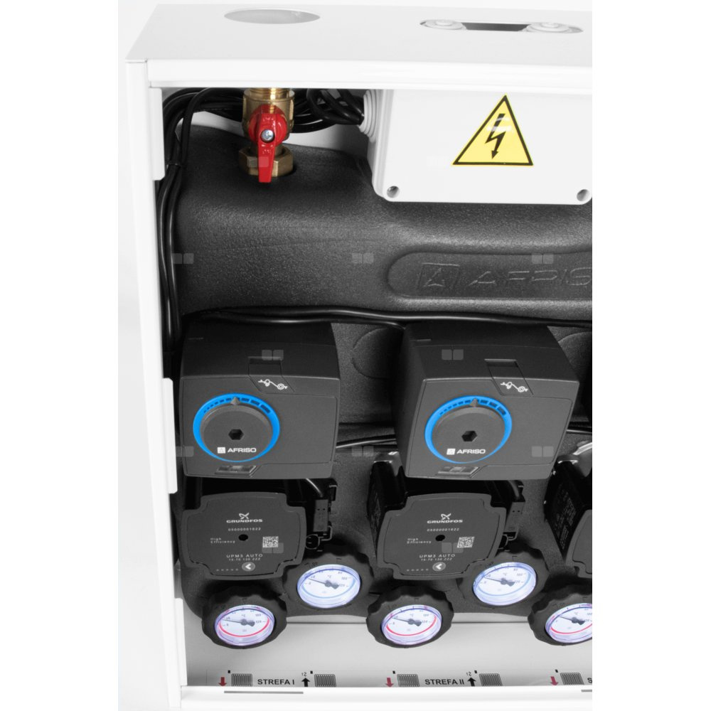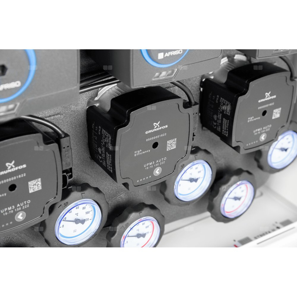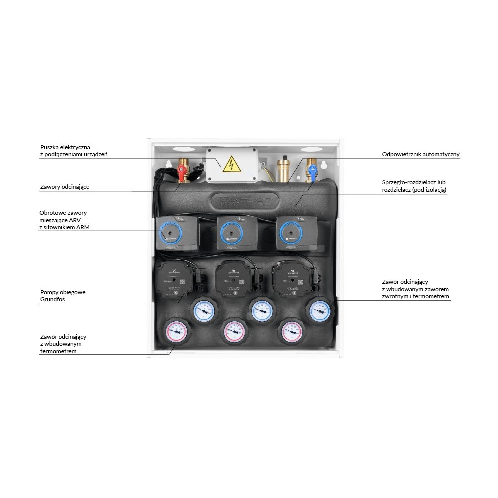 Wyposażony w pompy Grundfos UPm³ oraz zawory obrotowe z siłownikami ARM 141.