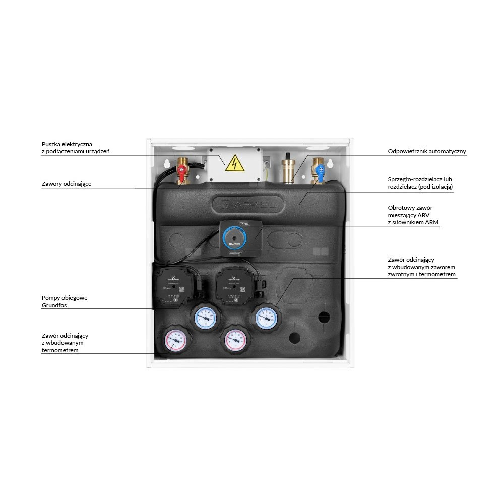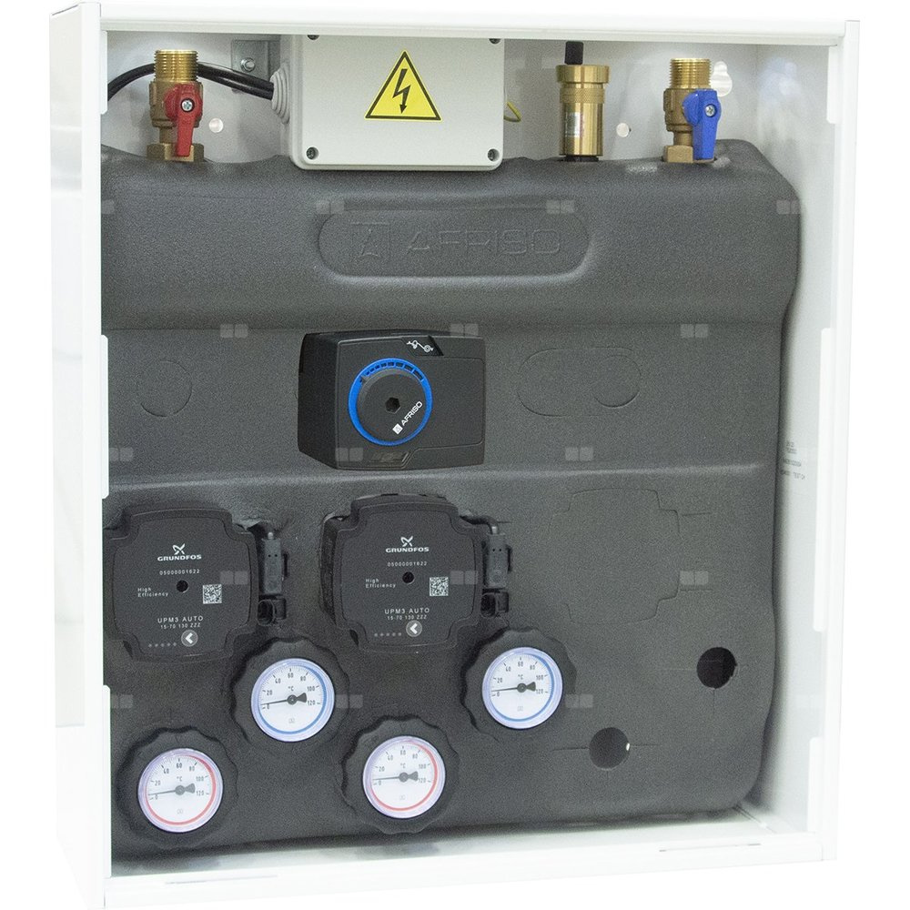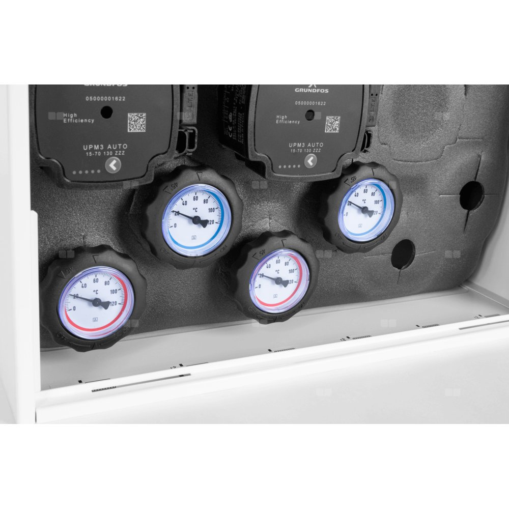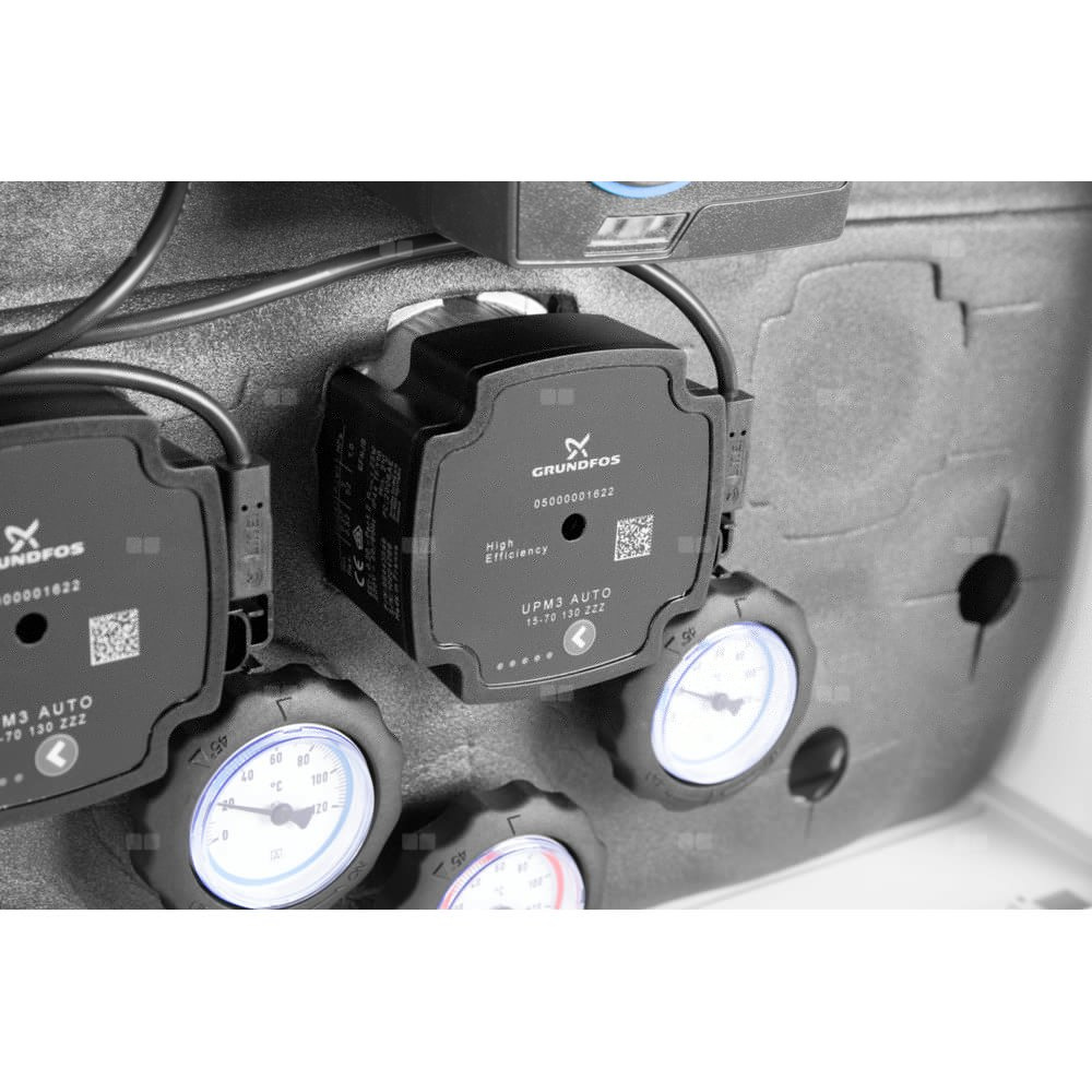 Wyposażony w pompy Grundfos UPm³ oraz zawór obrotowy z siłownikiem ARM 141