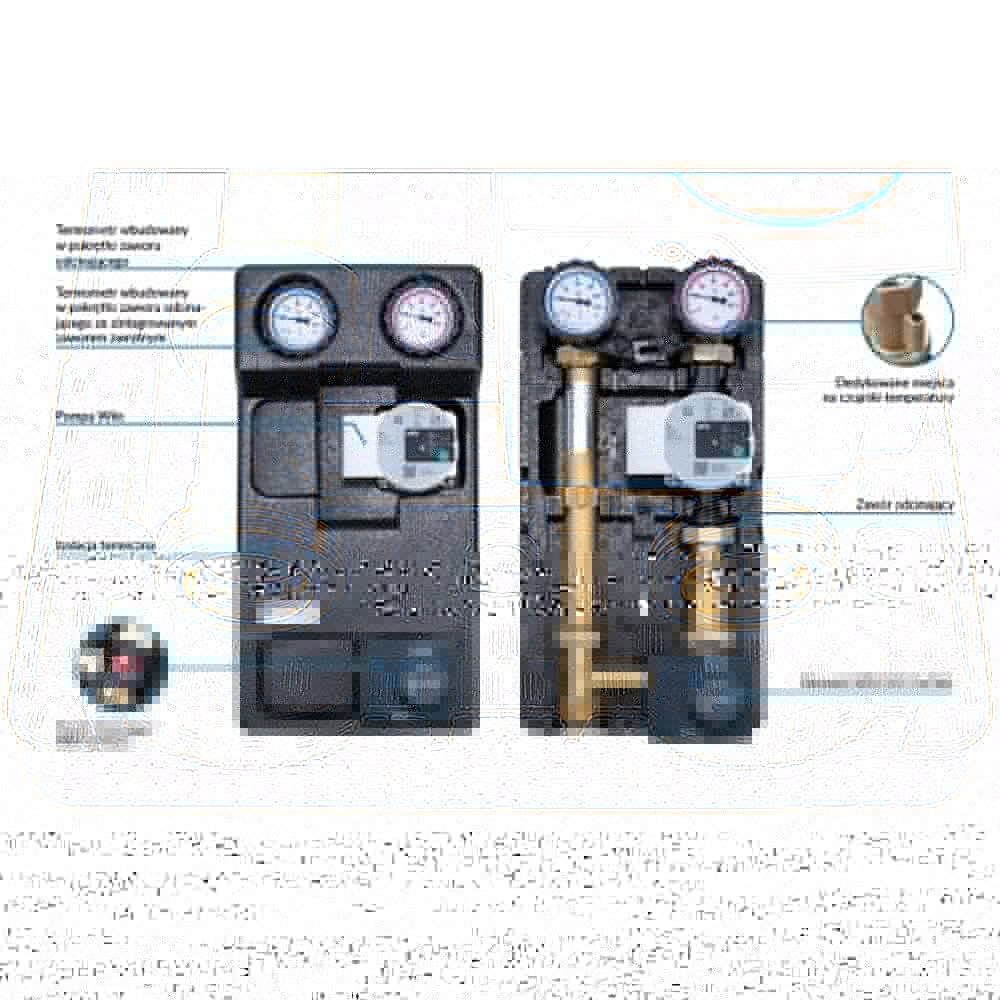 Zainstalowany zawór mieszający ARV KvsVario wartość Kvs ustawiana w zakresie 2,5÷12 m³/h, pompa Wilo Para SC 25/6 oraz siłownik ARM 343 ProClick (3-pkt., 230 V, 120 s).