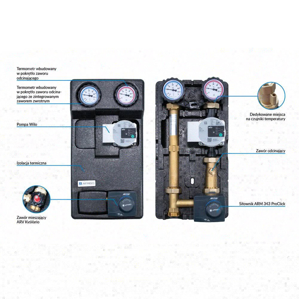 Grupa pompowa AFRISO PrimoTherm 180-2 DN 25 WP 3-WM-SM Vario GZ x GW 1 1/2'' x 1'', z zaworem mieszającym, z izolacją, z pompą obiegową Wilo Para SC 25/6, z siłownikiem arm 343 proclick