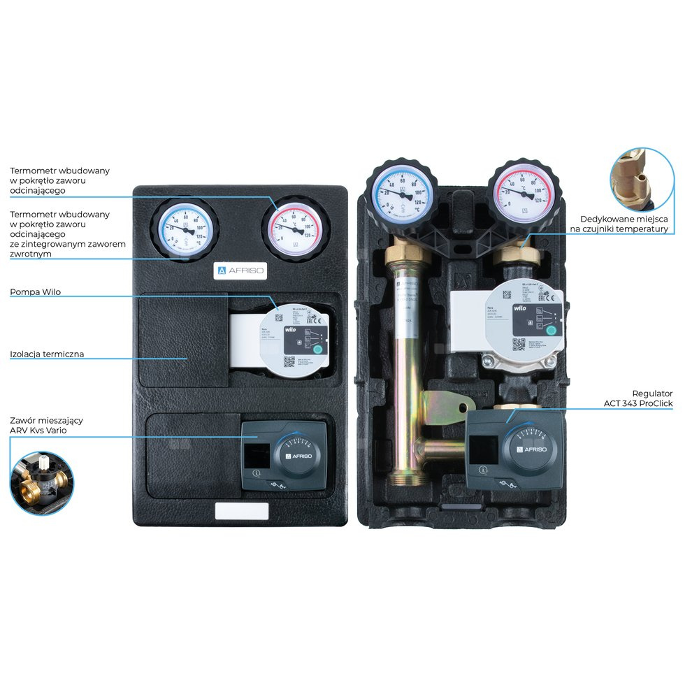 Grupa pompowa AFRISO PrimoTherm K 180-2 DN 25 WP 3-WM-R GZ x GW 1 1/2'' x 1'', z zaworem mieszającym, z izolacją, z pompą obiegową Wilo Para SC 25/6