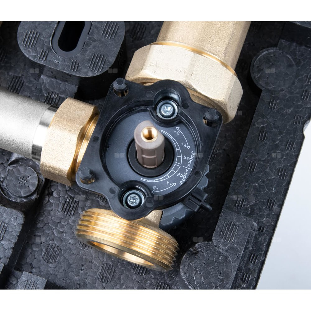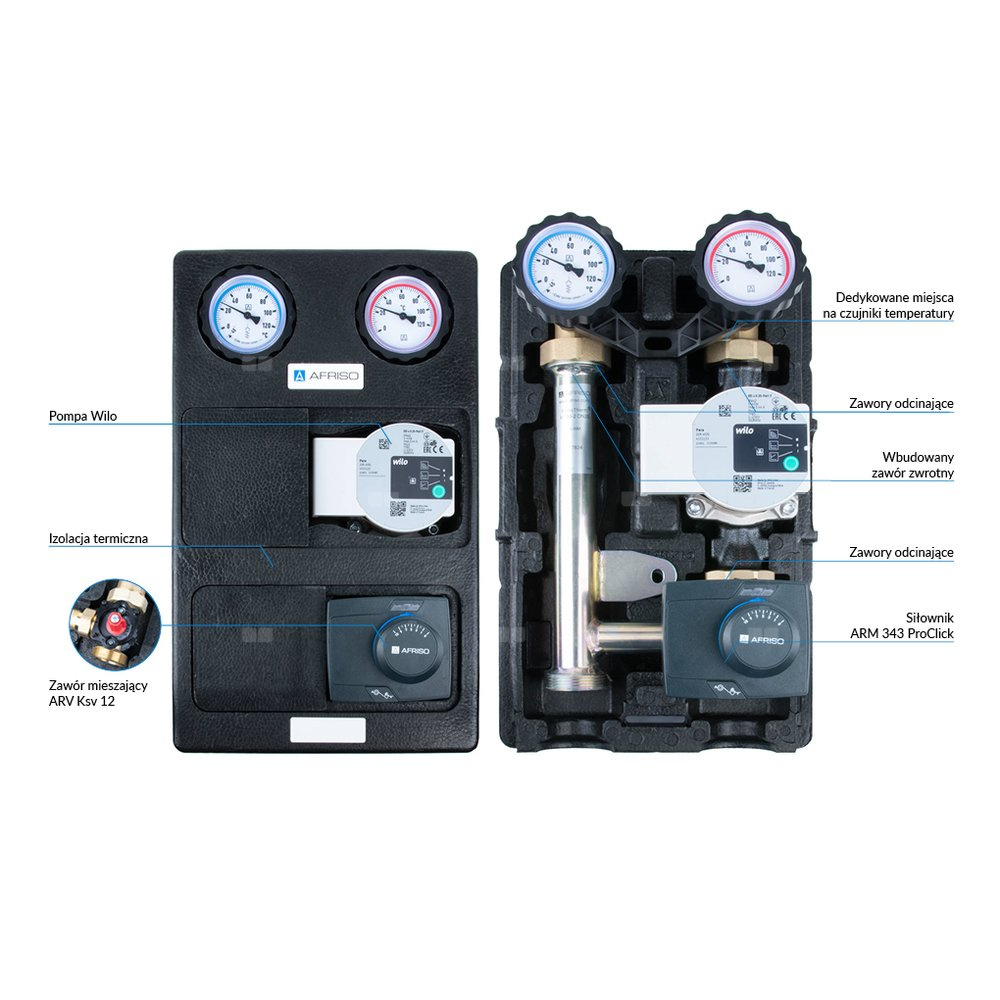 Grupa pompowa AFRISO PrimoTherm K 180-2 DN 25 WP 3-WM-SM GZ x GW 1 1/2'' x 1'', z zaworem mieszającym, z izolacją, z pompą obiegową Wilo Para SC 25/6, z siłownikiem arm 343 proclick