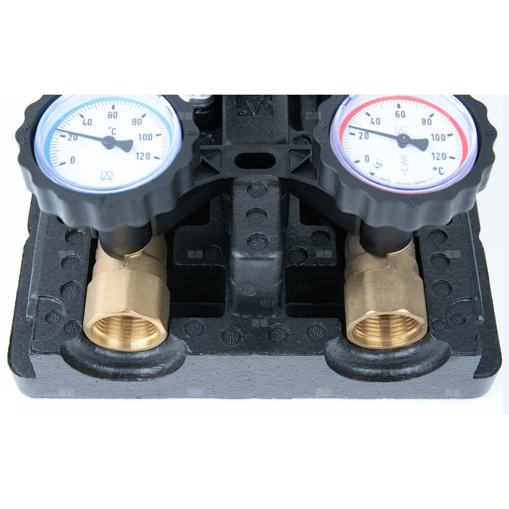 Wyposażona w niezbędne komponenty: termometry, zawór zwrotny, zawory odcinające na zasilaniu i powrocie, zawór odcinający przed pompą i izolację termiczną.