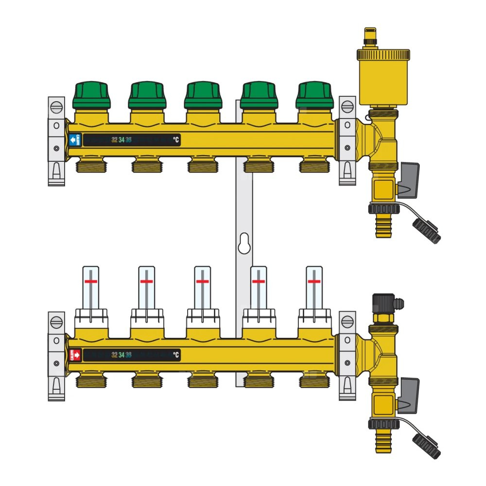 Zespół rozdzielaczy Zawiera: - rozdzielacz powrotny z wkładkami równoważącymi DYNAMICAL® przystosowanymi do współpracy z siłownikami elektrotermicznymi, zakres regulacji 25÷170 l/h; - rozdzielacz zasilania z przepływomierzami; - zakończenie rozdzielacza z automatycznym odpowietrznikiem z kapturkiem higroskopijnym i zaworem spustowym; - stalowe uchwyty montażowe do zastosowania w skrzynkach lub bezpośrednio na ścianie. główne podłączenie: G 1" (ISO 228-1) GW, Podłączenie do złączek Caleffi. przyłącza wylot: G 3/4" A (ISO 228-1) GZ, 6 wyjść. Maksymalne ciśnienie pracy: 6 bar. Zakres temperatury medium: 5–60 °C. Rozstaw wyjść: 50 mm. Zakres regulacji natężenia przepływu: 25–150 l/h.