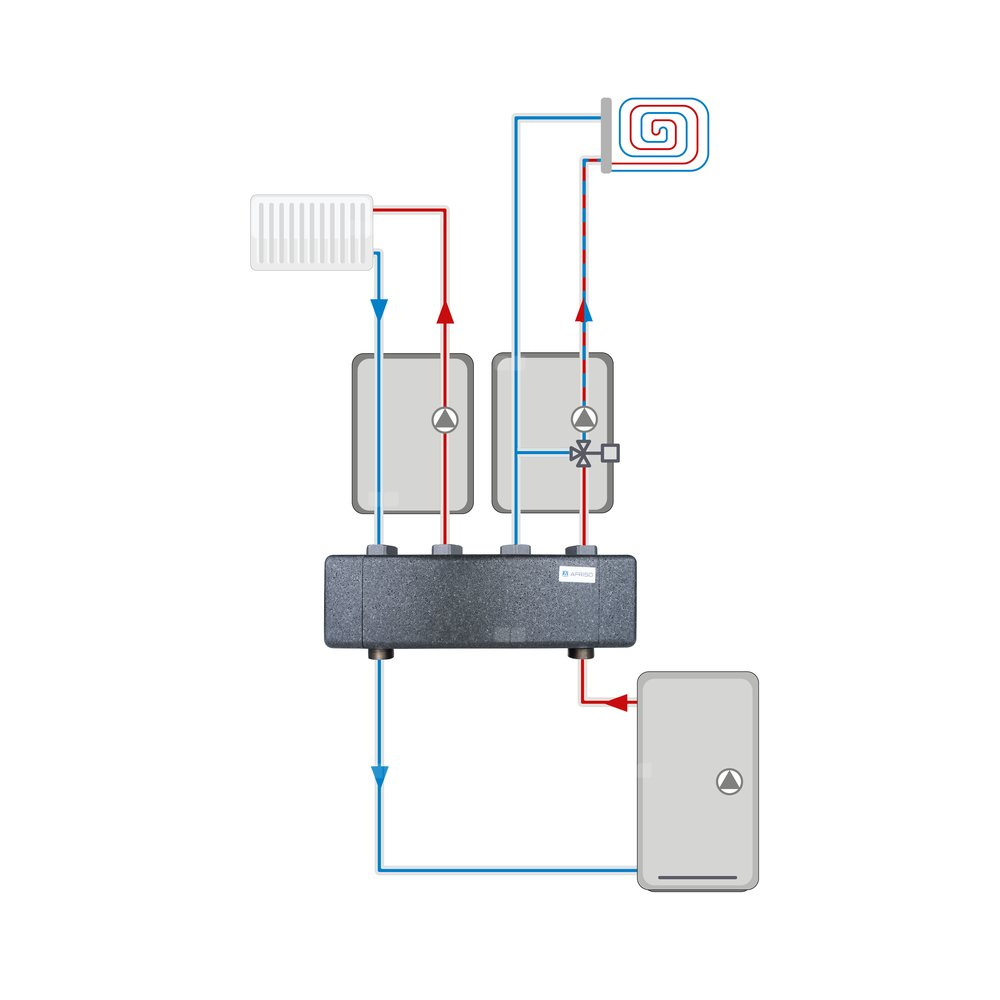 Stosowany w instalacjach grzewczych i chłodzących.Montowany na ścianie pomiędzy źródłem ciepła lub chłodu a grupami pompowymi.
