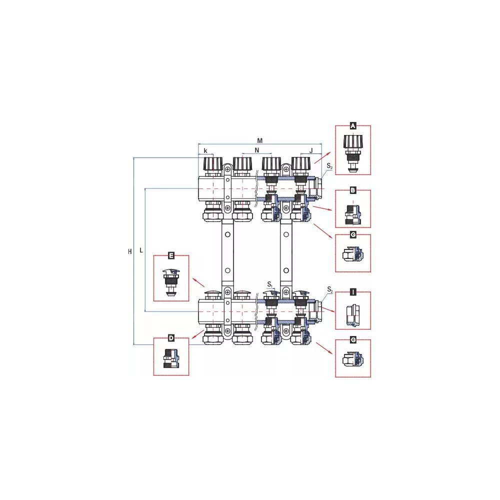 Rozdzielacze podłogowego ogrzewania przeznaczonesą do rozdzielenia medium grzewczegona poszczególne pętle grzewcze. W skład rozdzielacza 70B wchodzą: belka zasilająca     A  - zawory regulujące ręczne z pokrętłem      B  - nyple 1/2" x 3/4" z oringiem      G  - zaciski do rury pex/all/pex belka powrotna     E  - zawory regulujące ręczne na imbus      D  - nyple 1/2" x 3/4" z oringiem     G  - zaciski do rury pex/all/pex 2 uchwyty montażowe z amortyzatorami I  - 2 korki 1” z oringiem na klucz