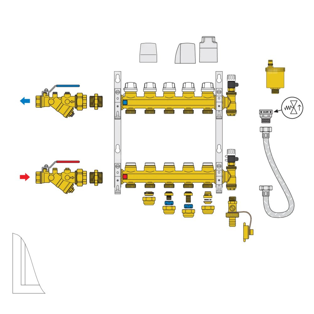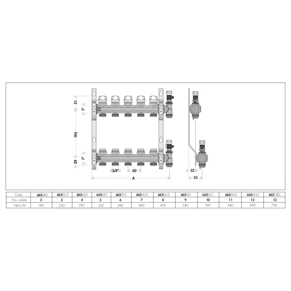 Zespół rozdzielaczy. Zawiera: -rozdzielacz powrotny z zaworami odcinającymi z możliwością przyłączenia siłownika termoelektrycznego; - rozdzielacz zasilający z zaworami do wstępnej regulacji natężenia przepływu; - zakończenia rozdzielacza z ręcznymi zaworami odpowietrzającymi i korkami; - uchwyty montażowe z polimeru z możliwością regulacji rozstawu do użycia ze skrzynką serii 659 lub 661 lub do montażu bezpośrednio na ścianie. Przyłącze: G 1" (ISO 228-1) GW, Podłączenie do złączek Caleffi. przyłącza wylot: G 3/4" A (ISO 228-1) GZ, 12 wyjść. Maksymalne ciśnienie pracy: 10 bar. Zakres temperatury medium: 5–100 °C. Rozstaw wyjść: 50 mm.