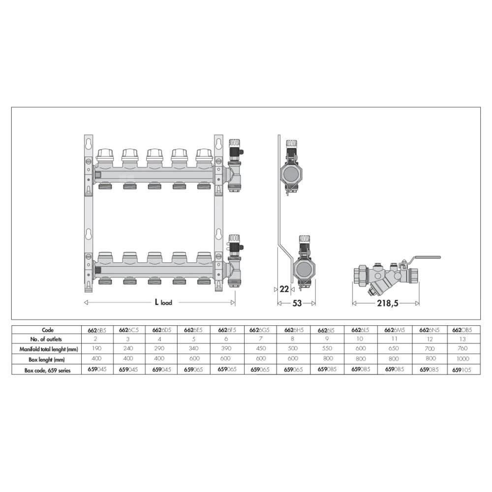 Zespół rozdzielaczy. Zawiera: -rozdzielacz powrotny z zaworami odcinającymi z możliwością przyłączenia siłownika termoelektrycznego; - rozdzielacz zasilający z zaworami do wstępnej regulacji natężenia przepływu; - zakończenia rozdzielacza z ręcznymi zaworami odpowietrzającymi i korkami; - uchwyty montażowe z polimeru z możliwością regulacji rozstawu do użycia ze skrzynką serii 659 lub 661 lub do montażu bezpośrednio na ścianie. Przyłącze: G 1" (ISO 228-1) GW, Podłączenie do złączek Caleffi. przyłącza wylot: G 3/4" A (ISO 228-1) GZ, 9 wyjść. Maksymalne ciśnienie pracy: 10 bar. Zakres temperatury medium: 5–100 °C. Rozstaw wyjść: 50 mm.