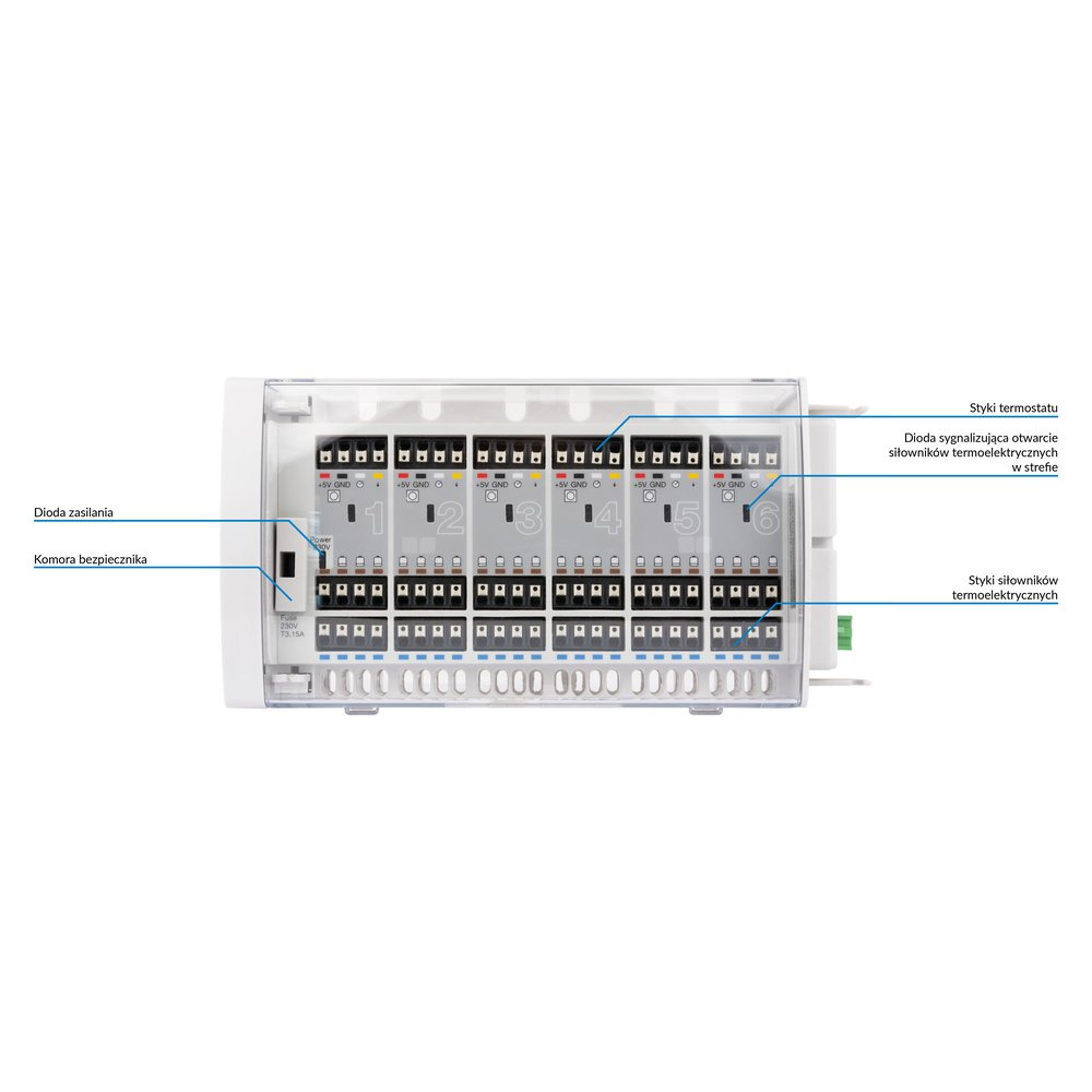 Steruje temperaturą w pomieszczeniach / strefach przez siłowniki termoelektryczne na podstawie sygnałów z termostatów tam umieszczonych.