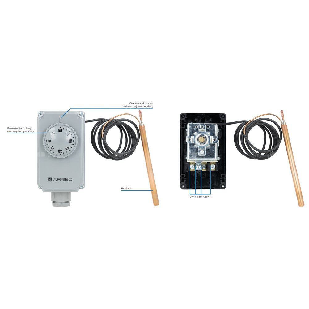 Wyposażony w kapilarę o długości 1000mm, co umożliwia montaż termostatu z dala od miejsca pomiaru.