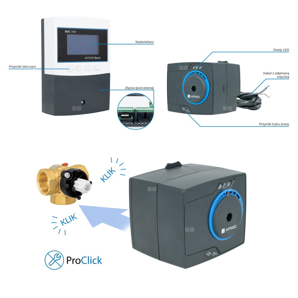 Urządzenia wyposażone w system ProClick – pozwala na bezpośredni montaż siłownika na zaworze bez użycia dodatkowych narzędzi.