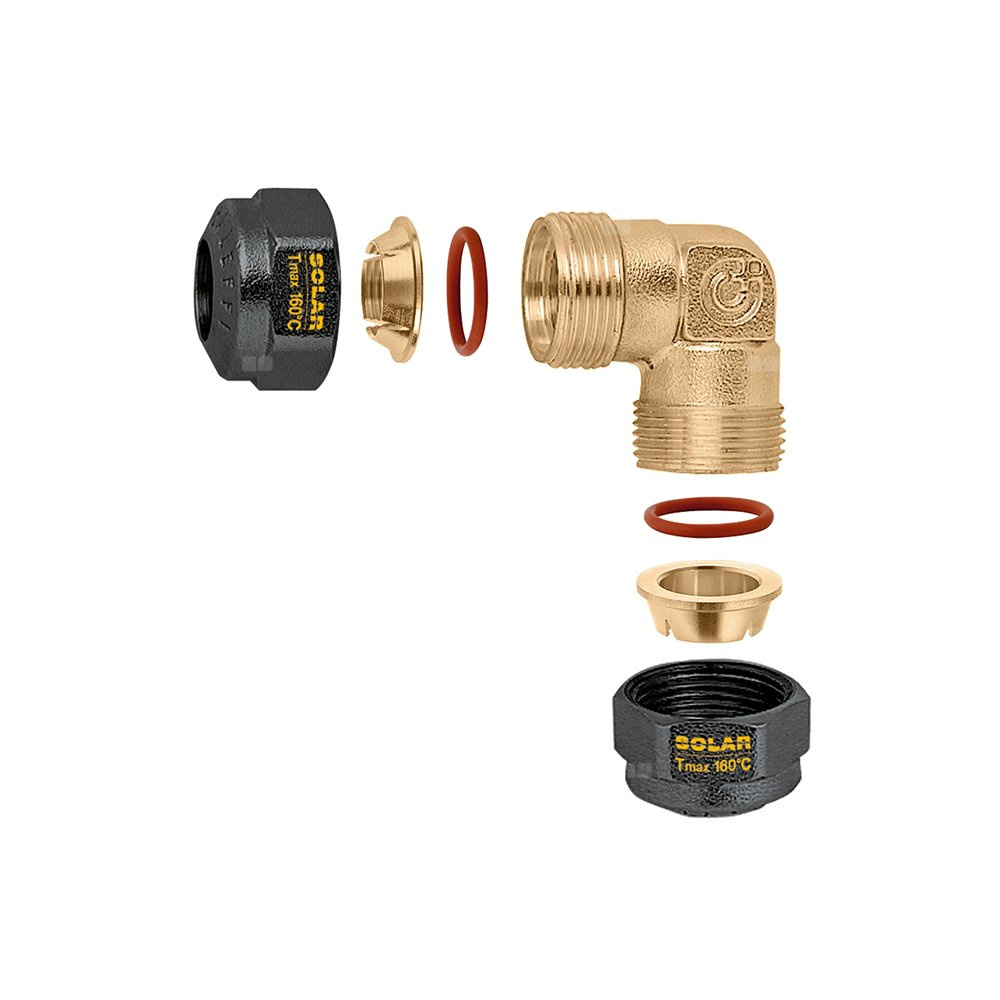 Kolanko, skręcane, uszczelka O-Ring do instalacji solarnych Do rur z miedzi wyżarzonej, twardej miedzi, mosiądzu, stali miękkiej i stali nierdzewnej. Nakrętka niklowana, czarna. Przyłącze: Ø 15. Maksymalne ciśnienie pracy: 16 bar. Zakres temperatury medium: -30–160 °C. Maksymalne stężenie glikolu: 50 %. Medium: woda, Roztwory glikolu.
