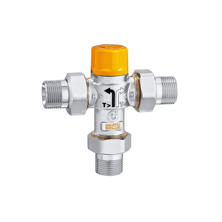 Termostatyczny zawór rozdzielający do instalacji solarnych Przyłącze: G 1/2" A (ISO 228-1) GZ. Maksymalne ciśnienie pracy: 10 bar. Zakres temperatury medium: 0–100 °C. Zakres regulacji temperatury: 35–55 °C. Kv: 1,5 m³/h. Materiał: stop mosiądzu odporny na odcynkowanie.