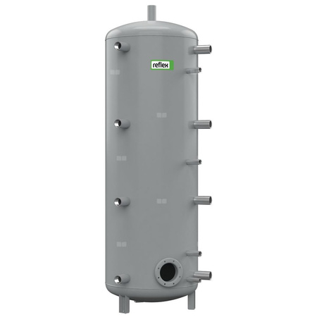 Zasobnik buforowy do wody grzewczej i chłodniczej. W wersji stojącej do wyboru z kołnierzem lub bez kołnierza lub z jedną wężownicą/dwiema wężownicami do podłączenia zewnętrznych źródeł energii.