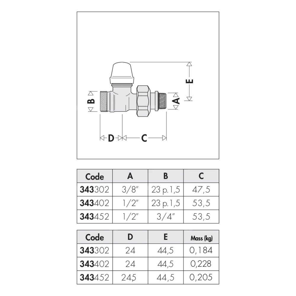 Prosty, grzejnikowy zawór odcinający podłącznie rury: 23 p. 1,5, wlot, podłączenie proste, Podłączenie do złączek Caleffi. podłączenie grzejnika: G 3/8" A (ISO 228-1) GZ, wylot, podłączenie proste. Maksymalne ciśnienie pracy: 10 bar. Zakres temperatury medium: 5–100 °C. Wykończenie: chromowane. Kvs: 1,32 m³/h. Materiał: mosiądz.
