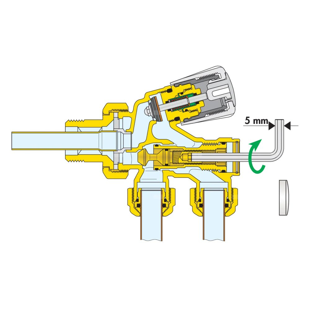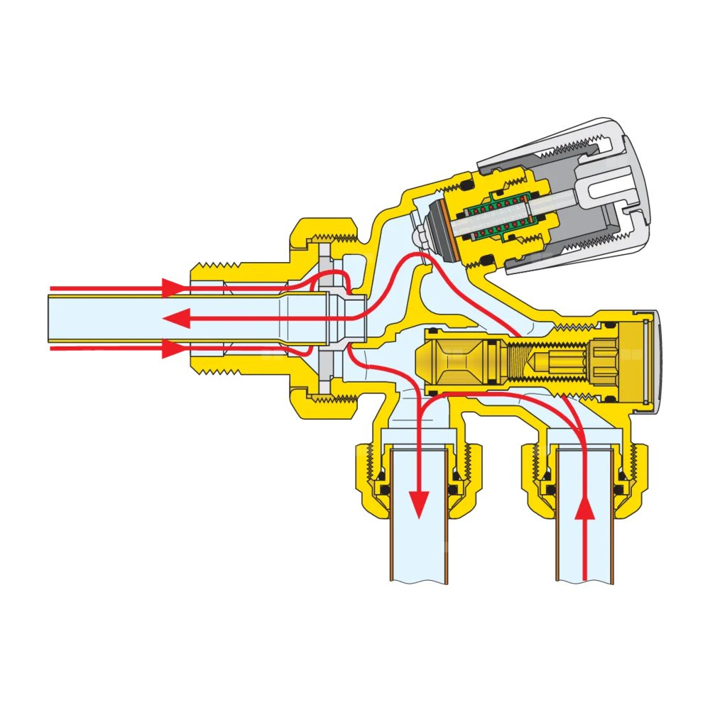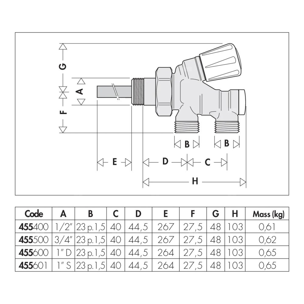 Grzejnikowy zawór termostatyczny z pokrętłem przystosowany do montażu głowic termostatycznych, elektronicznych i siłowników termoelektrycznych Ustawienie fabryczne dla instalacji jednorurowych, możliwość przystosowania dla instalacji dwururowych. podłączenie grzejnika: G 1" A (ISO 228-1) GZ, wlot, lewy, Podłączenie do złączek Caleffi. podłącznie rury: 23 p. 1,5, wylot. Maksymalne ciśnienie pracy: 10 bar. Zakres temperatury medium: 5–100 °C. Długość sondy: 30 cm. Rozstaw przyłączy głównych: 40 mm. Wykończenie: chromowane. Kv jednorurowe: 2,0 m³/h. Kv dwururowe: 1,10 m³/h. Materiał: mosiądz.