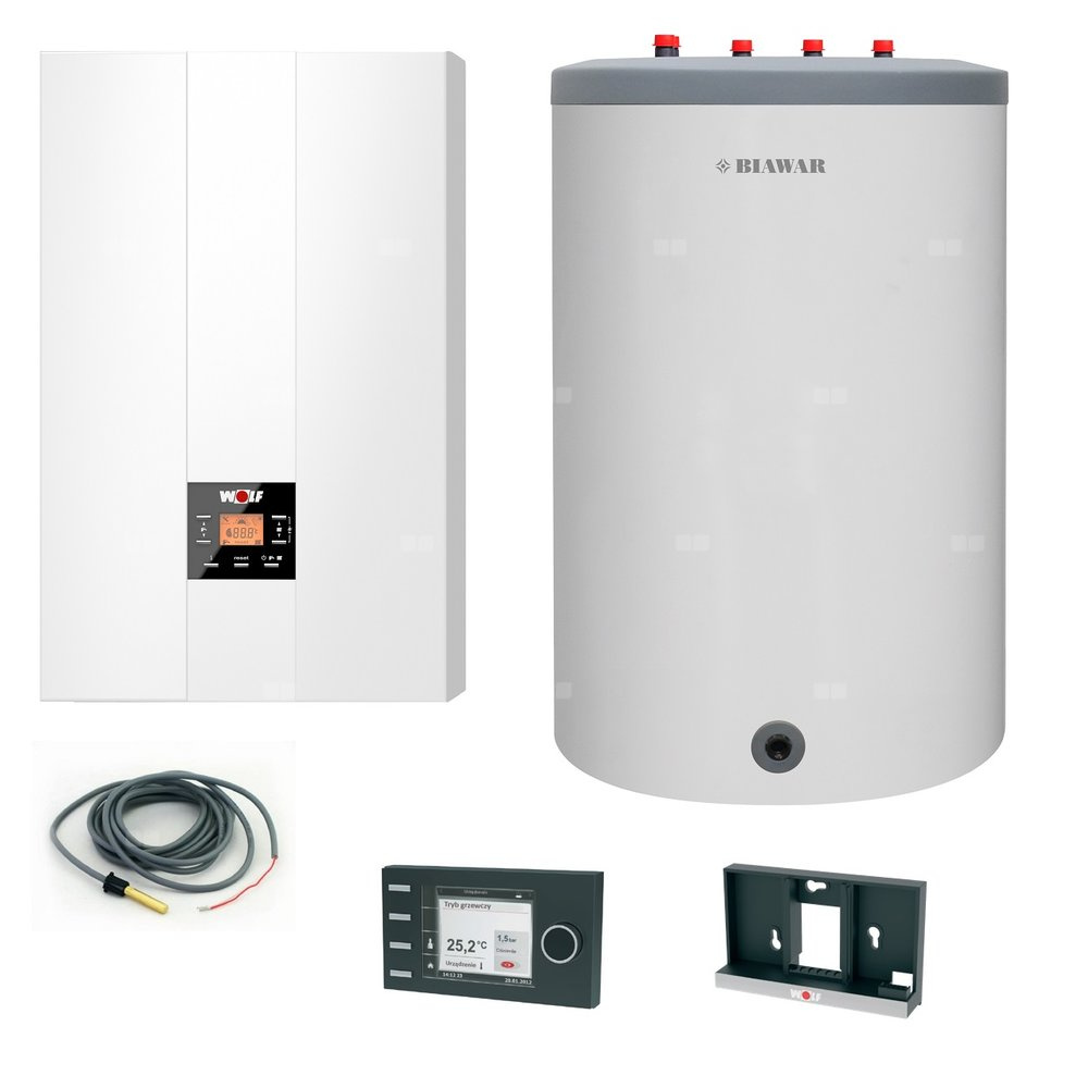 Gazowy kocioł kondensacyjny Wolf FGB 24 z zasobnikiem c.w.u. Biawar Lindo 150 i czujnikiem temperatury c.w.u. oraz modułem pogodowym BM-2 i podstawą ścienną do modułu BM-2.