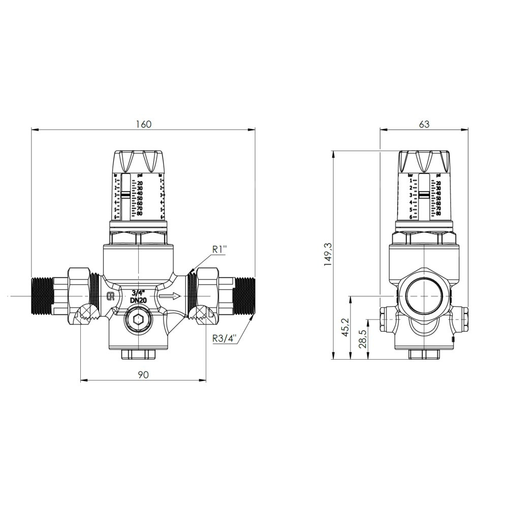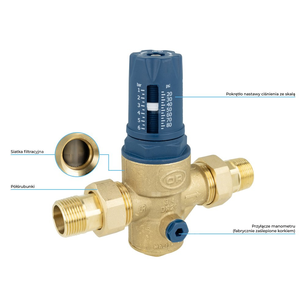 Obniża i stabilizuje ciśnienie wody do ustawionej wartości niezależnie od zmian ciśnienia na wlocie do reduktora.