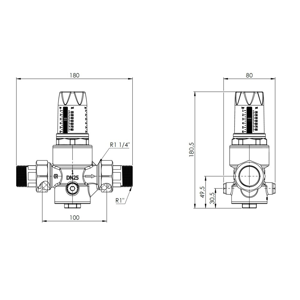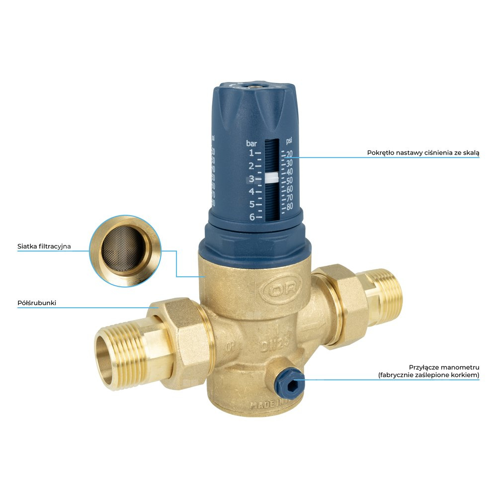 Obniża i stabilizuje ciśnienie wody do ustawionej wartości niezależnie od zmian ciśnienia na wlocie do reduktora.