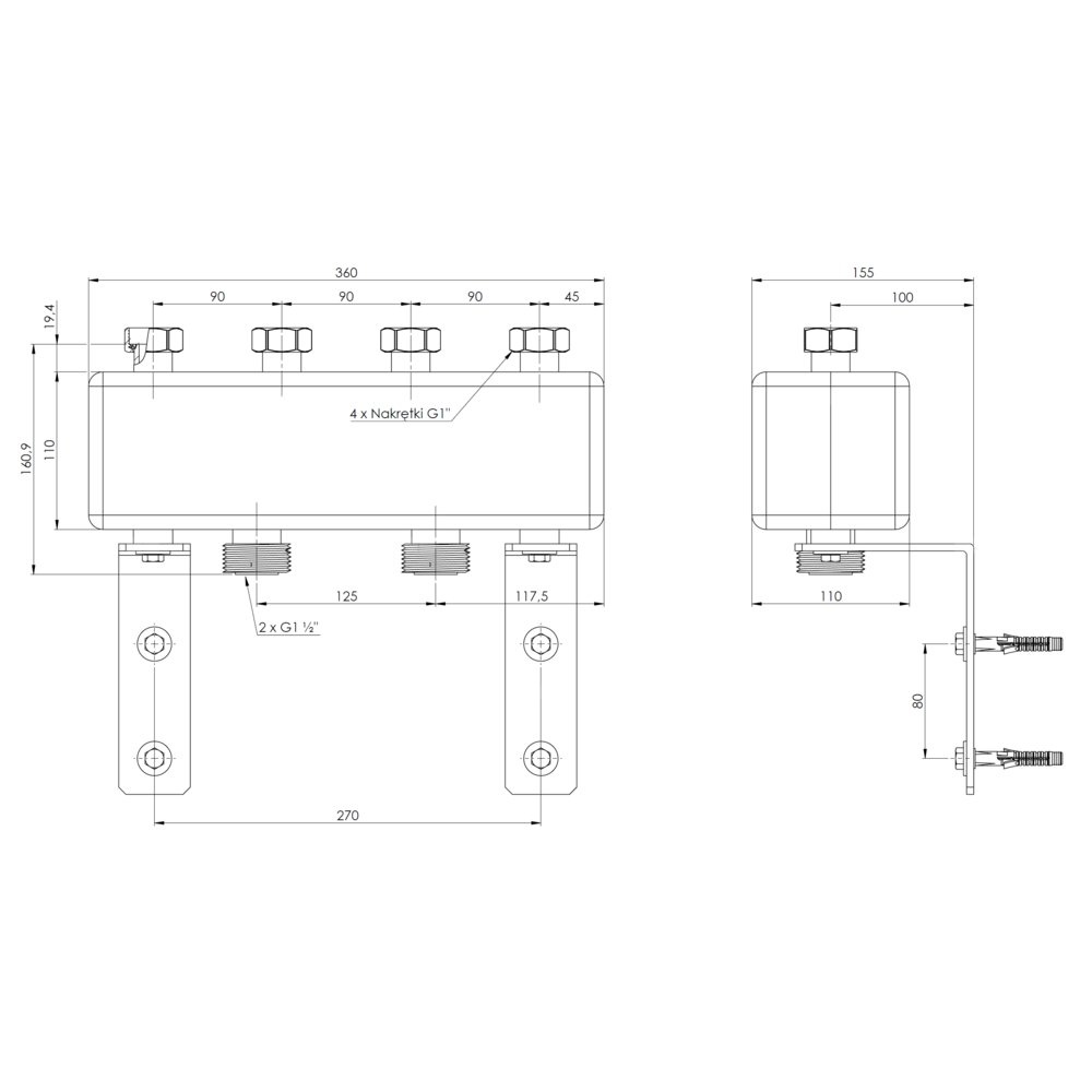 Przyłącza od strony instalacji dostosowane do grup pompowych o rozstawie przyłączy 90 mm.