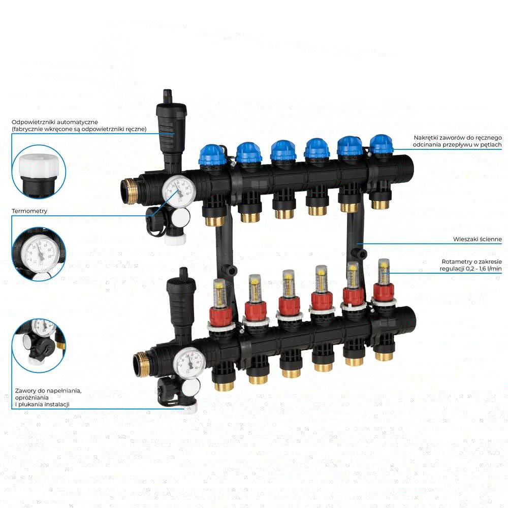 Rozprowadza ciepło/chłód ze źródła na poszczególne pętle instalacji płaszczyznowej.