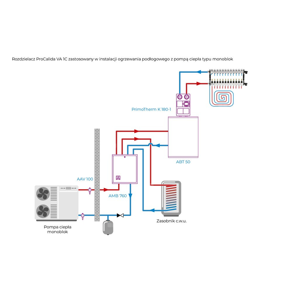 Rozprowadza ciepło/chłód ze źródła na poszczególne pętle instalacji płaszczyznowej.