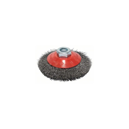 | Tekst produktu, osprzęt szary | Szczotka stożkowa, drut falisty Idealna do pracy w trudno dostępnych miejscach (ze względu na stożkowy kształt pędzla). Odpowiednia do lekko i średnio intensywnego czyszczenia z wysoką prędkością obwodową małych powierzchni metalowych, w rowkach lub na krawędziach, np. do usuwania rdzy, zdzierania, szlifowania na mat, usuwania powłok malarskich, usuwanie koloru wyżarzania na spawanych szwach. Odpowiednia do wszystkich szlifierek kątowych z gwintem M14 i szlifierek GGS 6 S Professional |
