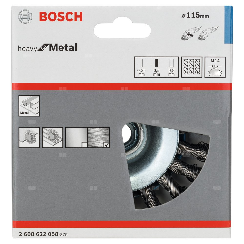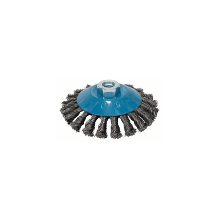 | Tekst produktu, osprzęt szary | Szczotka stożkowa, drut pleciony Idealna do pracy w trudno dostępnych miejscach (ze względu na stożkowy kształt pędzla). Odpowiednia do intensywnego czyszczenia z wysoką prędkością obwodową małych powierzchni metalowych, w rowkach lub na krawędziach, np. do usuwania grubej rdzy, zdzierania powłok malarskich, odżużlania, wygładzania, usuwania kamienia i czyszczenia szwów spawanych. Odpowiednia do wszystkich szlifierek kątowych z gwintem M14 i szlifierek GGS 6 S Professional |