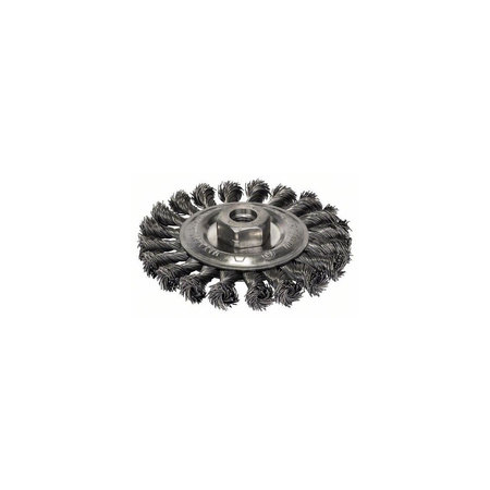 | Tekst produktu, osprzęt szary | Szczotka tarczowa – drut pleciony Optymalne narzędzie do czyszczenia spawów. Do ciężkich prac związanych z czyszczeniem z dużą prędkością obwodową mniejszych powierzchni metalowych, rowków lub krawędzi, jak np. usuwanie silnej korozji, usuwanie lakieru, żużlu, zadziorów i zgorzeliny. Do wszystkich szlifierek kątowych z gwintem M 14 oraz szlifierki prostej GGS 6 S Professional |