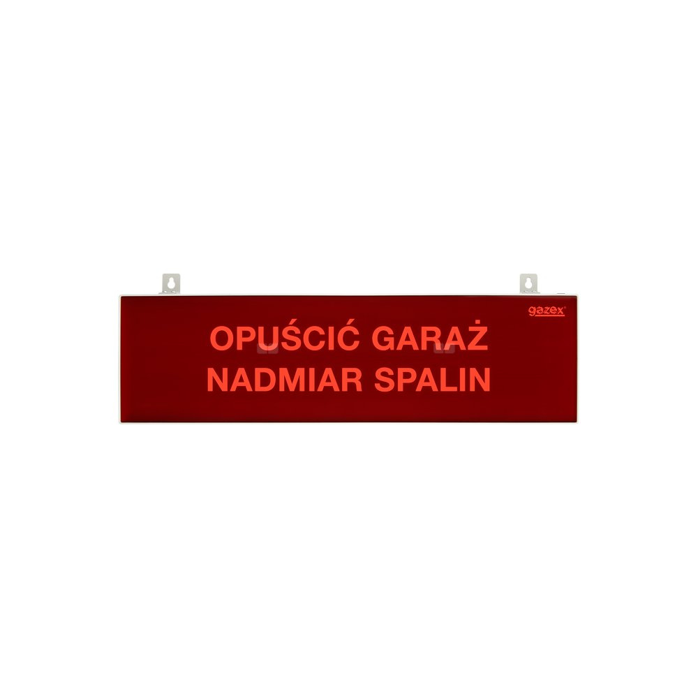 tablica ostrzegawcza dwustronna "OPUŚCIĆ GARAŻ NADMIAR SPALIN", podświetlenie czerwone LED, wbudowana cicha syrenka, zasilanie 230V