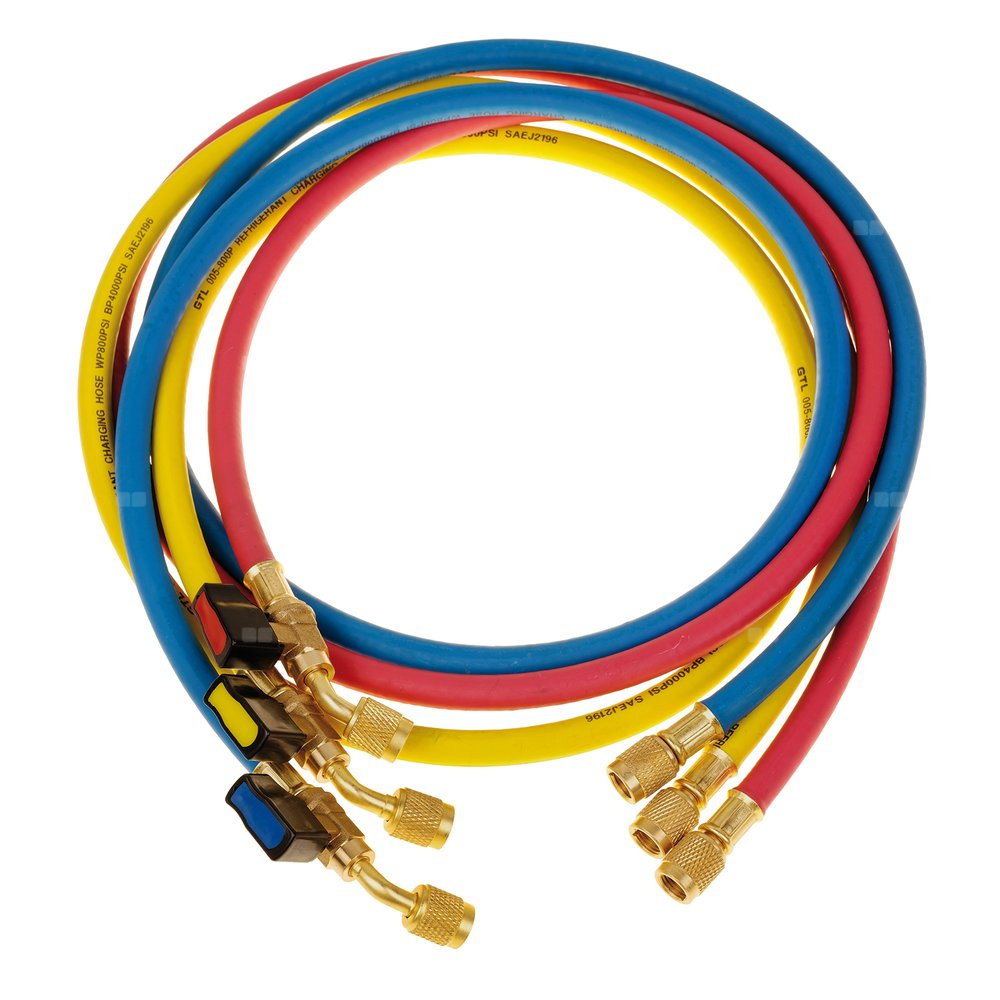 Mocne i wytrzymałe węże ciśnioniowe. Długość 1,5 m. Trzy sztuki w zestawie oznaczone kolorami.