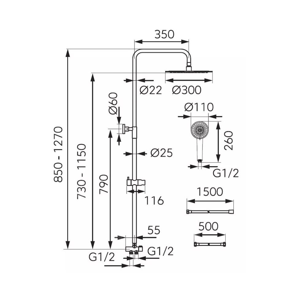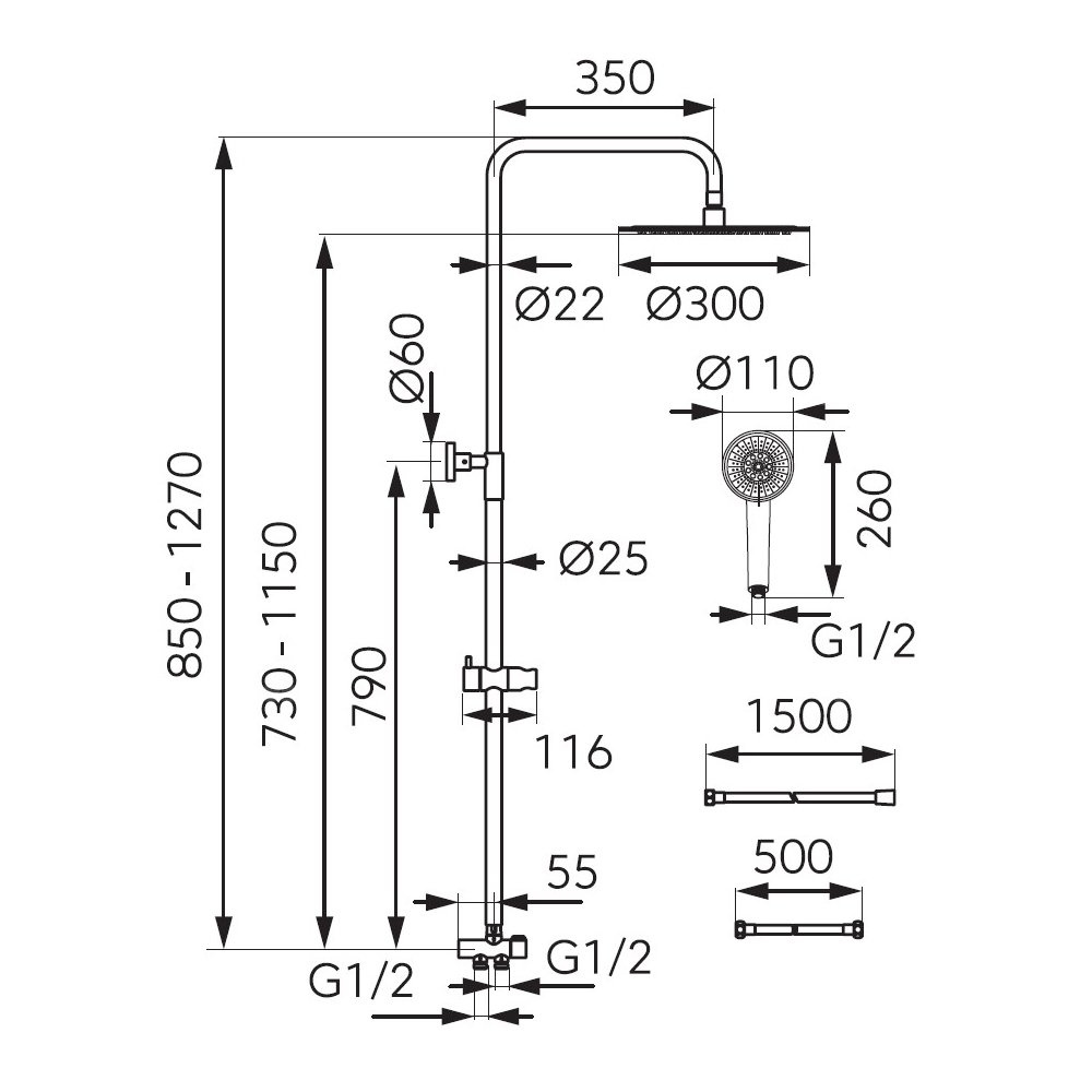 • wąż podłączeniowy 500 mm z nakrętką G1/2 - uniwersalne podłączenie do każdej baterii wannowej i natryskowe