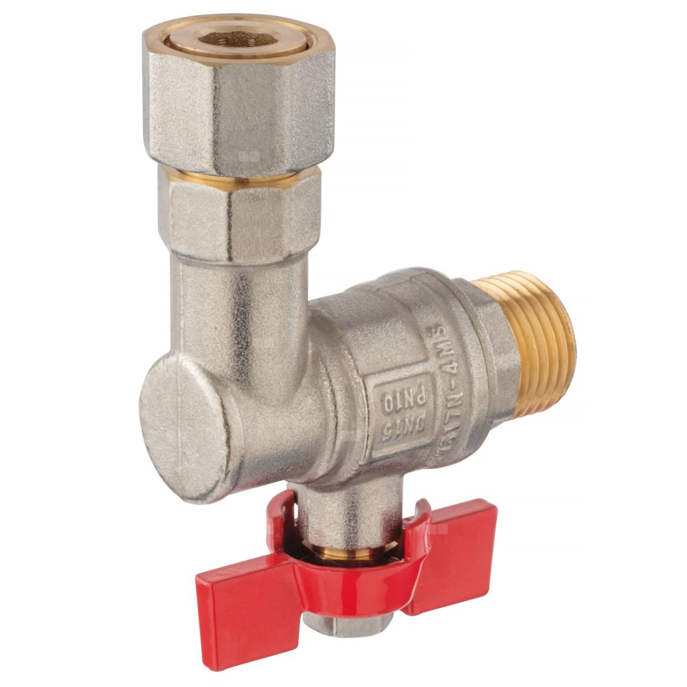 Zawór kątowy z obrotową nakrętką. Uszczelnienie płaskie, uszczelka EPDM. Konstrukcja zaworu umożliwia prosty montaż i demontaż urządzeń. Zawór wykonany jest z wysokogatunkowego mosiądzu CW617N - 4MS. Zastosowanie w instalacjach, gdzie medium to woda lub woda/glikol. Uchwyt zaworu w postaci motylka umieszczony jest pod korpusem zaworu