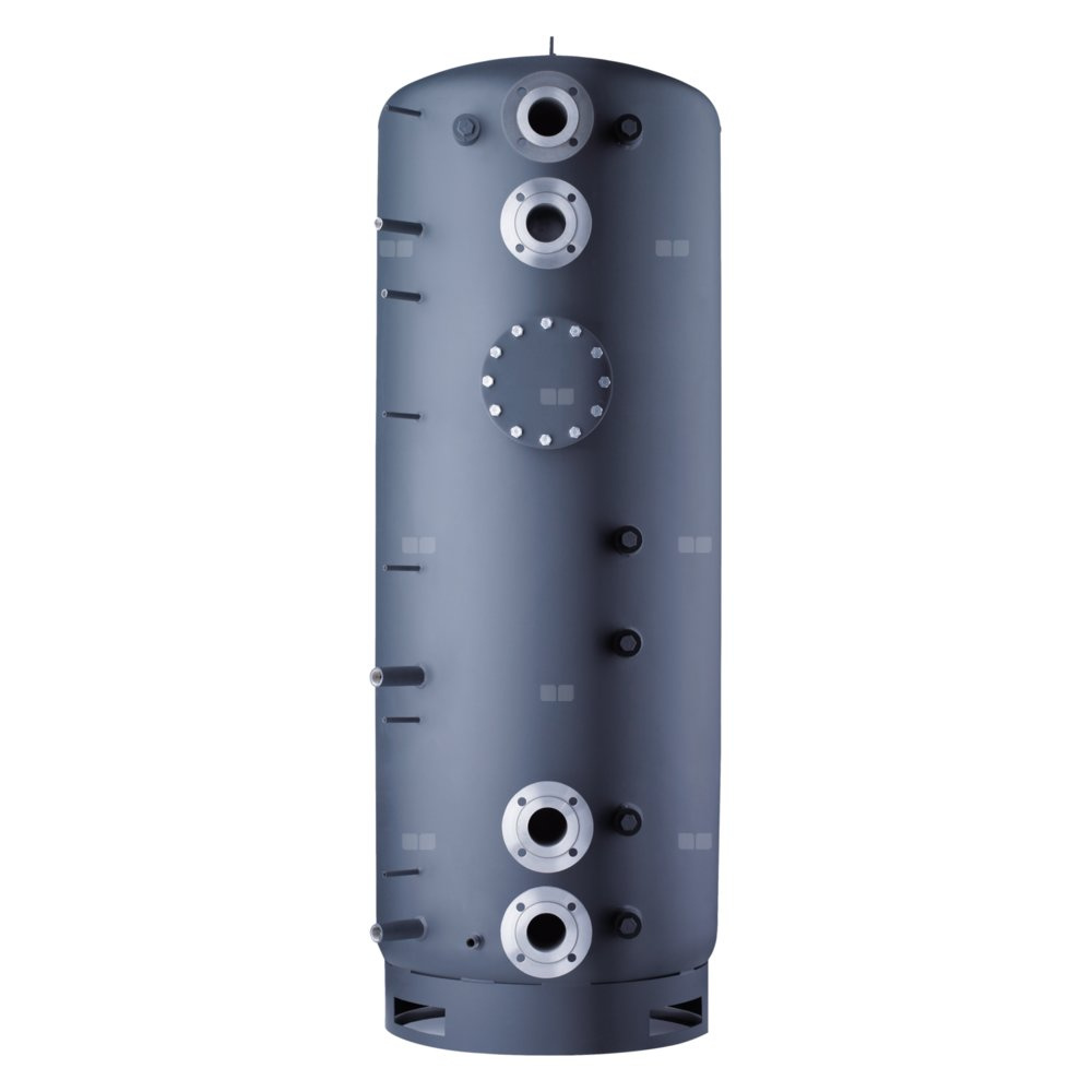 • Izolowany zbiornik stalowy z przyłączami kołnierzowymi rozmieszczonymi jedno nad drugim do przodu do obiegu pierwotnego i wtórnego.Dodatkowe króćce przyłączeniowe do współpracy z dodatkowymi wytwornicami ciepła.