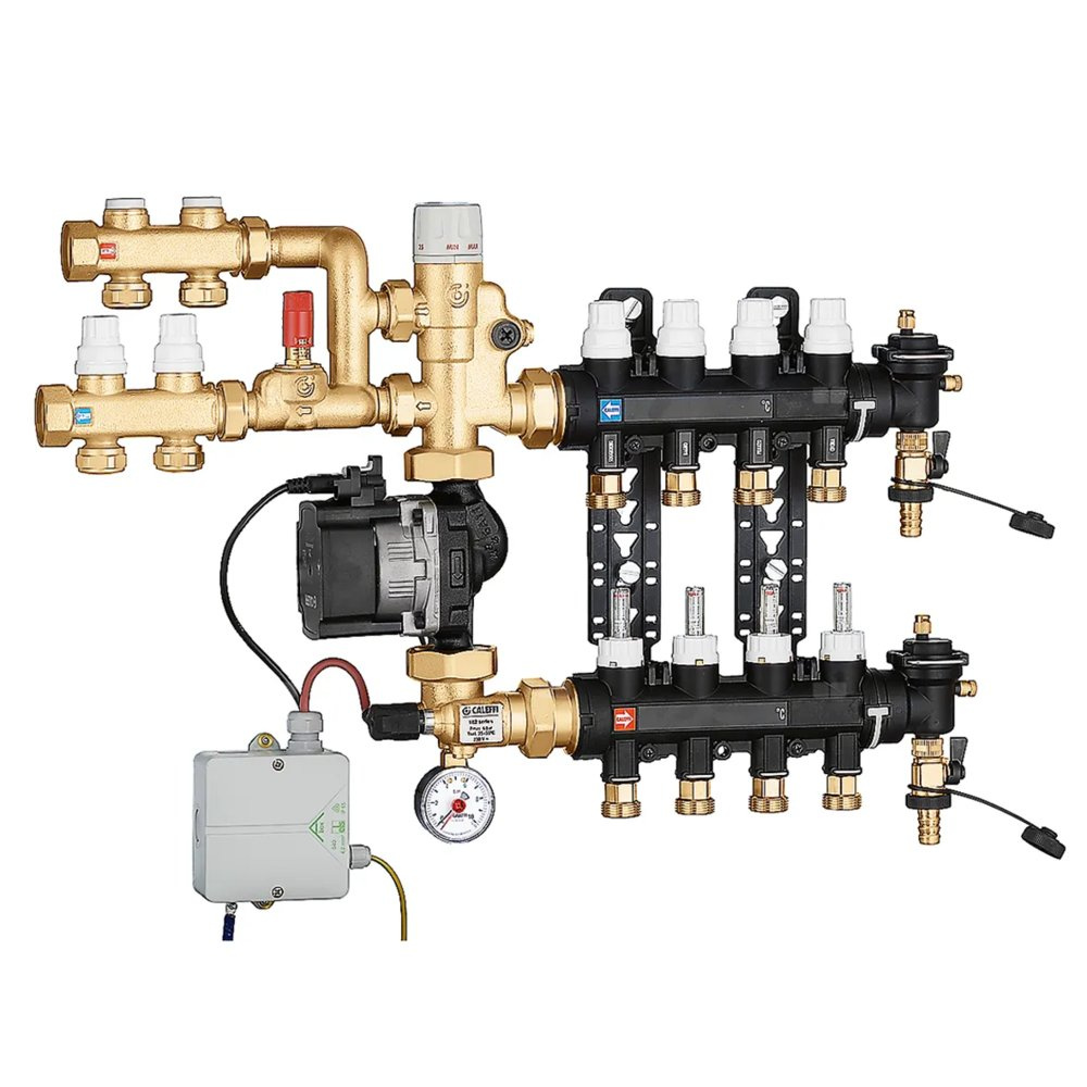 Zespół regulacyjny - regulacja stałotemperaturowa. 7 wyjść. Dodatkowy rozdzielacz obiegu pierwotnego z dwoma wyjściami.