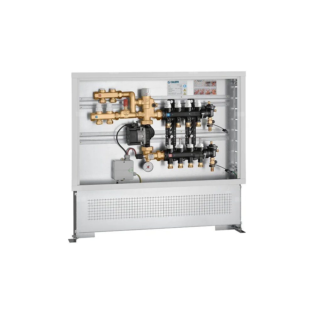 Zespół regulacyjny - regulacja stałotemperaturowa. Wstępnie zmontowany w skrzynce inspekcyjnej. Dodatkowy rozdzielacz obiegu pierwotnego.  W komplecie: - termostatyczny ukłąd regulacji; - para rozdzielaczy z zaworami regulacyjnymi i zaworami odcinającymi obiegu pierwotnego; - para rozdzielaczy z kompozytu z wbudowanymi przepływomierzami i zaworami odcinającymi; - zestaw obejściowy obiegu pierwotnego; - termostat bezpieczeństwa; - wysokowydajna pompa UPM3 Auto L 25-70; - skrzynka inspekcyjna naścienna ze wspornikami podłogowymi.  Przyłącze: G 1" (ISO 228-1) GW, Podłączenie do złączek Caleffi. przyłącza wylot: G 3/4" A (ISO 228-1) GZ, 5 wyjść. podłączenie obieg pierwotny: G 3/4" A (ISO 228-1) GZ, 2 wyjścia. Maksymalne ciśnienie pracy: 6 bar. Zakres regulacji temperatury: 25–55 °C. Zasilanie elektryczne: 230 V (AC). Szerokość: 800.