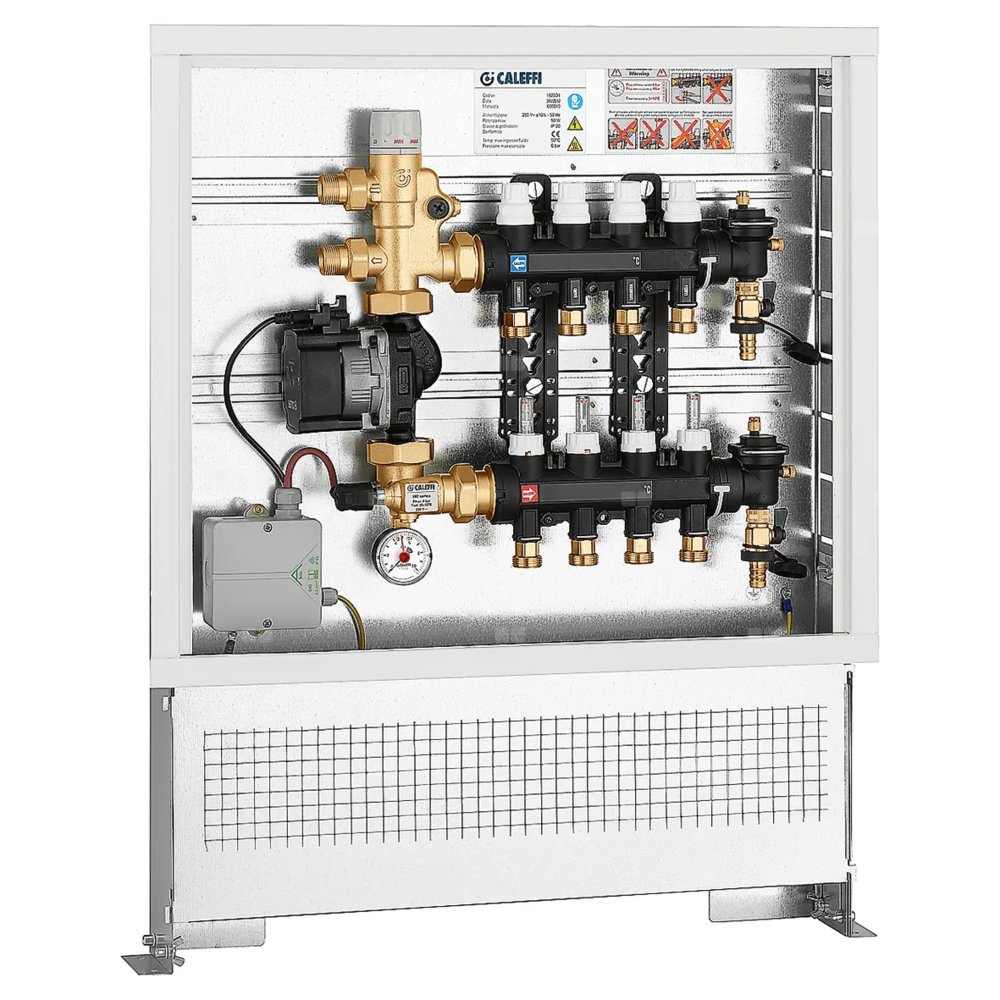 Zespół regulacyjny – regulacja stałotemperaturowa. Wstępnie zmontowany w skrzynce inspekcyjnej W zestawie: - termostatyczny układ regulacji; - para rozdzielaczy z kompozytu z wbudowanymi przepływomierzami i zaworami odcinającymi; - termostat bezpieczeństwa; - wysokowydajna pompa UPM3 Auto L 25-70; - skrzynka inspekcyjna naścienna ze wspornikami podłogowymi. Przyłącze: G 3/4" A (ISO 228-1) GZ, Podłączenie do złączek Caleffi. przyłącza wylot: G 3/4" A (ISO 228-1) GZ, 7 wyjść. Maksymalne ciśnienie pracy: 6 bar. Zakres regulacji temperatury: 25–55 °C. Zasilanie elektryczne: 230 V (AC). Szerokość: 800.