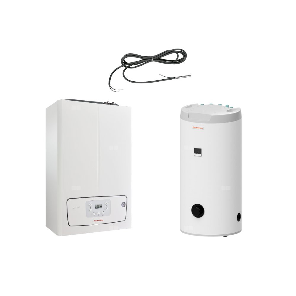 Victrix TERA 35 Standard 125 to zestaw z kondensacyjnym kotłem jednofunkcyjnym VICTRIX TERA V2 35 PLUS EU i zasobnikiem c.w.u. ze stali emaliowanej o pojemności 125 litrów oraz sondą temperatury do zasobnika